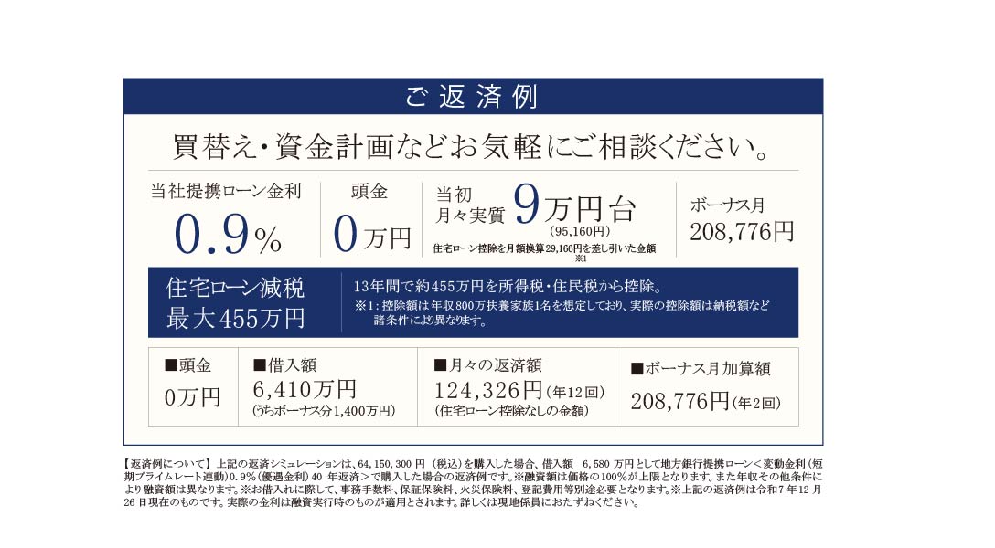 ※建築条件付宅地について/当分譲宅地は、土地売買契約後3カ月以内に、当社と建物の建築請負契約を締結することを条件として販売いたします。この期間に建築請負契約が成立しなかった場合には、土地売買契約は白紙解除となり、売主は受領した申込金その他お預かりしている金銭(本契約書に貼付した収入印紙は除く)を無利息にて買主に返還いたします。